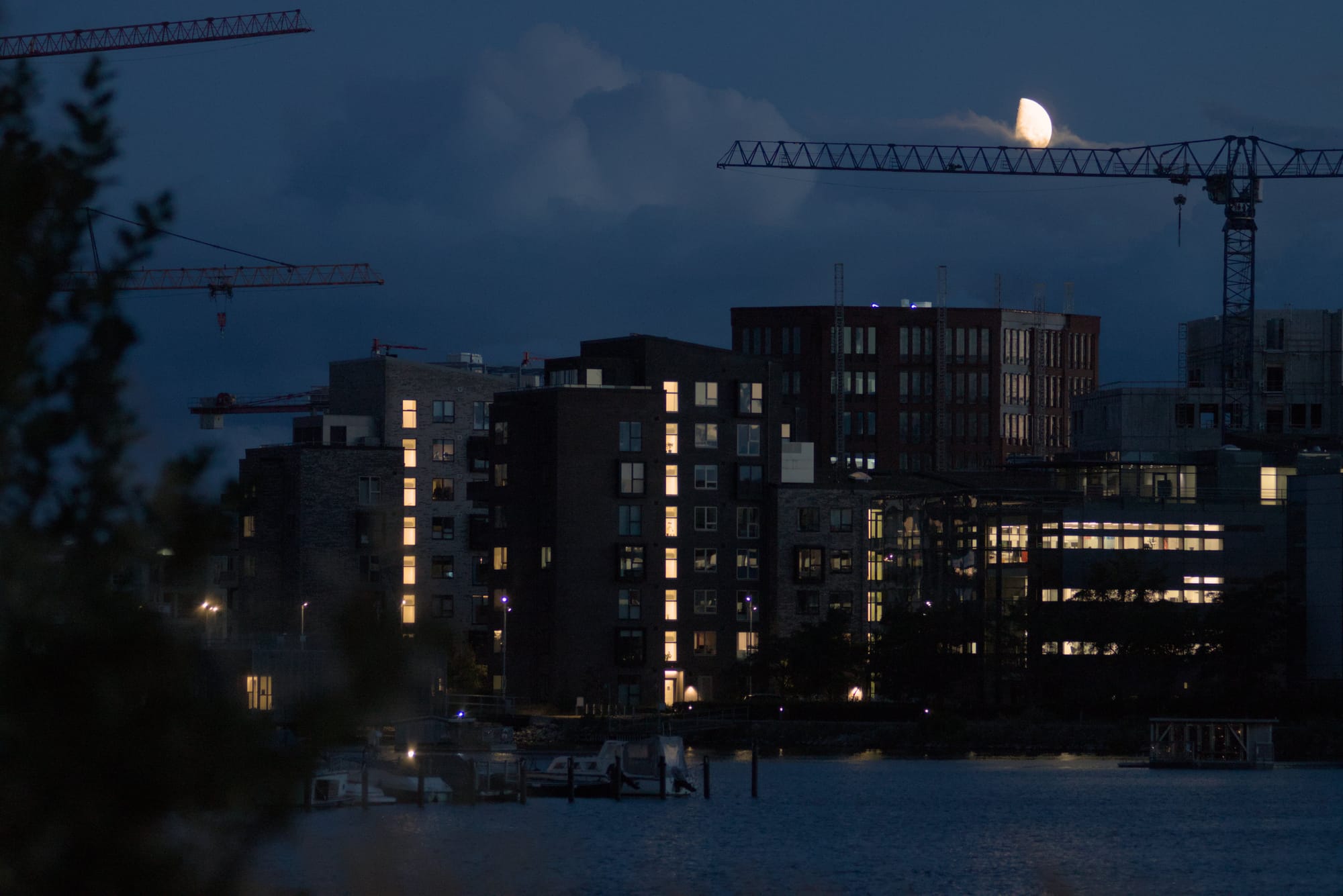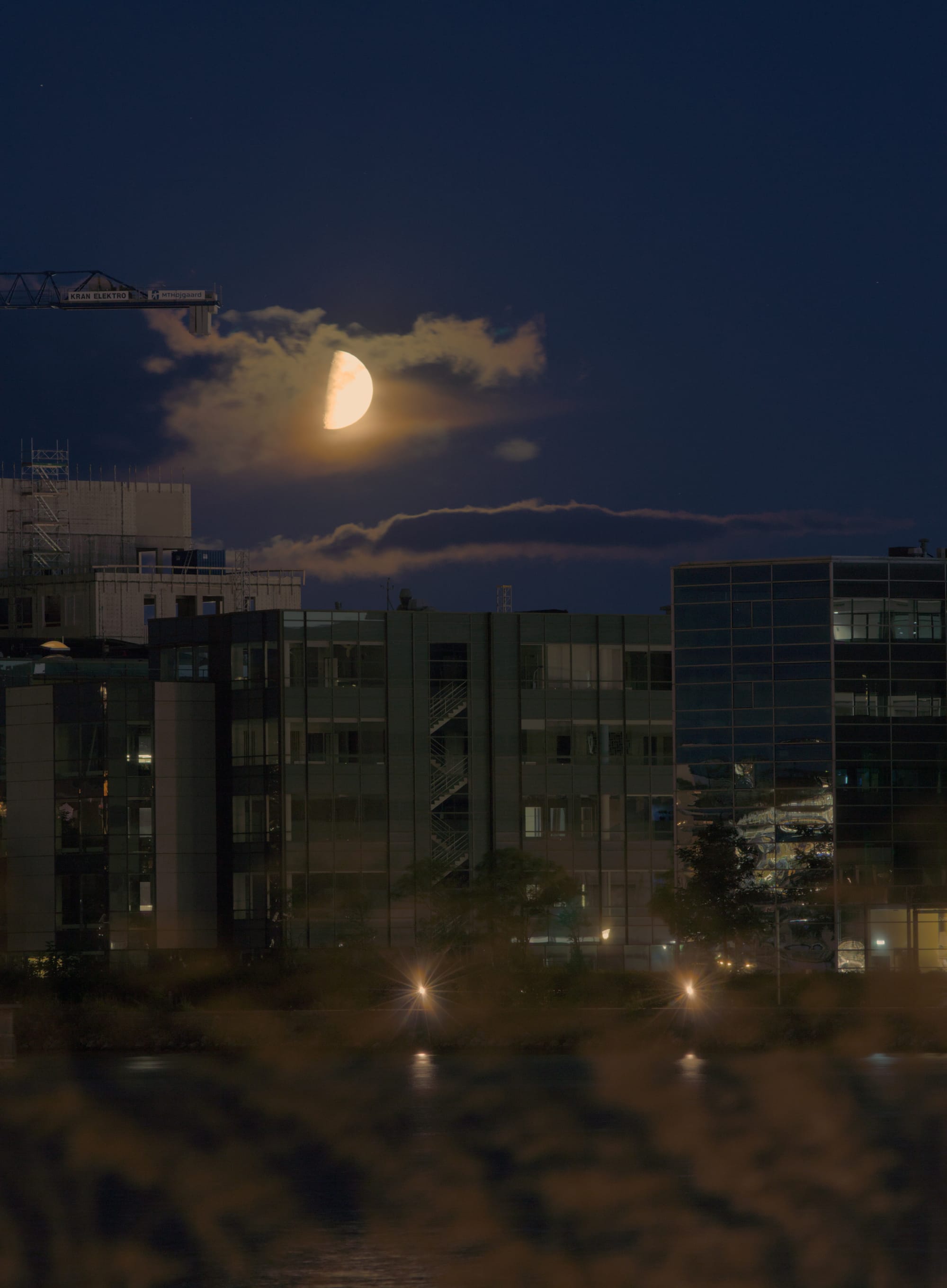 I sadly missed my timing, but managed to get out and try my hand at some tripod long exposures of the nearly half-moon tonight. While I didn't get my golden hour, I certainly discovered some golden hues in a beautiful contrast to the purpling sky.